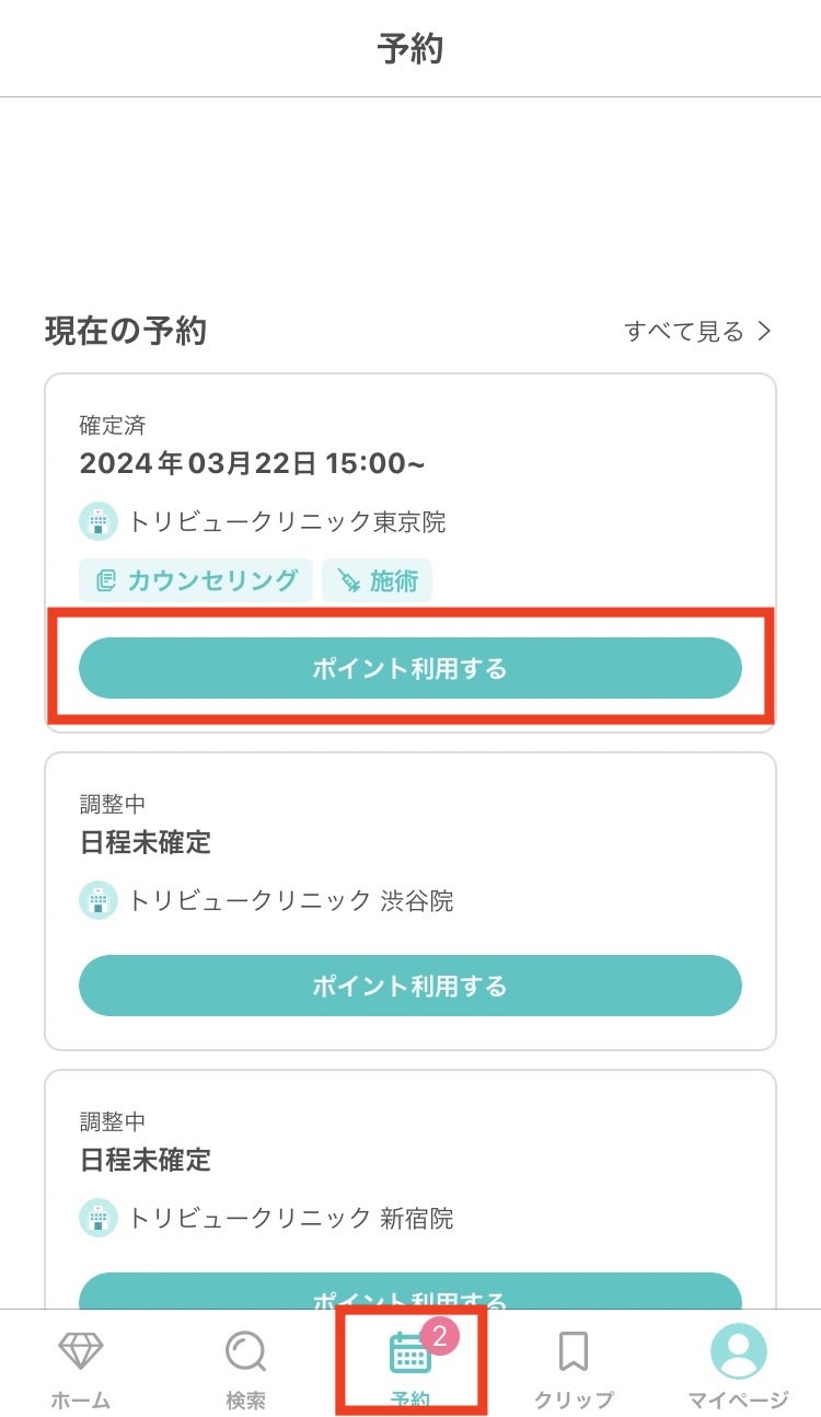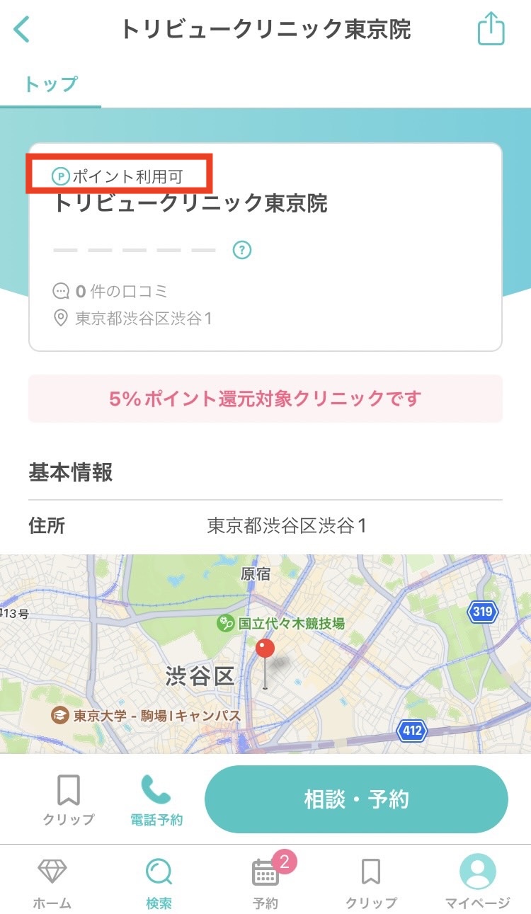「ポイント利用可」の表示があるクリニックでのみ利用可能です。予約時にご確認をお願いいたします。