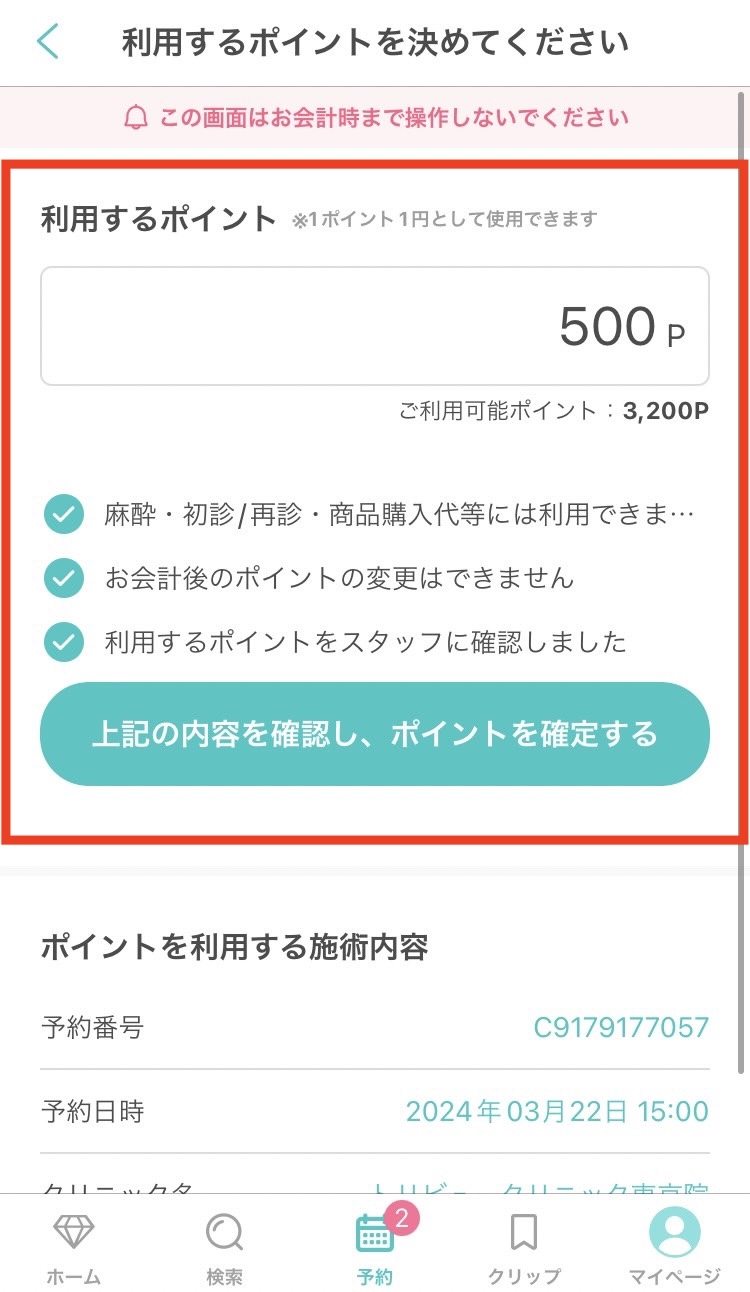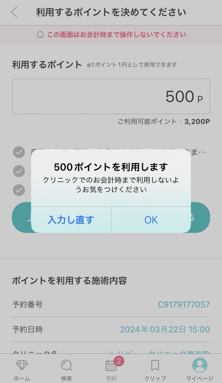 一部クリニックではポイント利用数に下限がございますが、当該するクリニックの場合予約フォームの注意事項にその旨記載しております